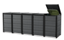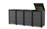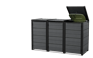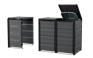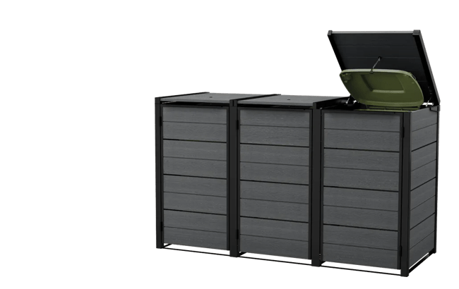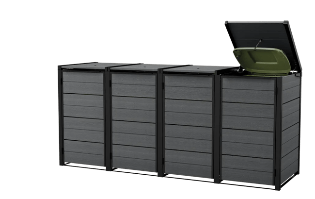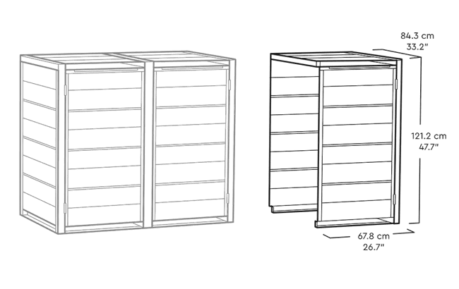 Keter’s Hideaway storage units combine a sleek modern look with smart features and functionality.They come in a wide range of finishes, including our exclusive Evotech material .The base model includes two units to store two bins, with the extension kit they can be expanded to accommodate as many additional bins as you need — perfect for sorting recycling or for owners who generate a lot of trash.Each unit is opens individually, and has a piston mechanism that lifts the unit top and the bin lid at the same time for easy access.