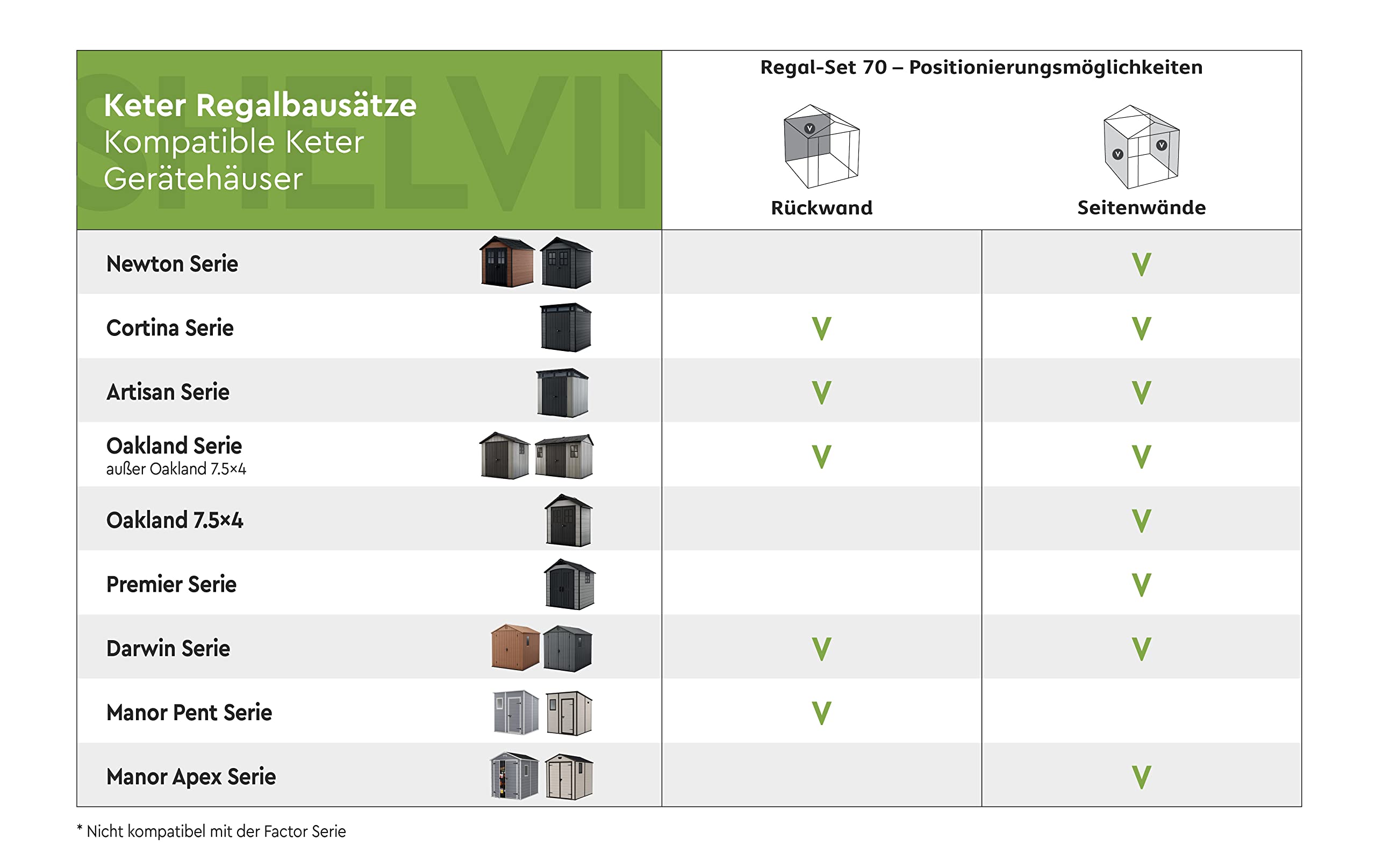- Compatible with Cortina, Newton, Artisan, Oakland, Premier, Darwin and Manor Sheds