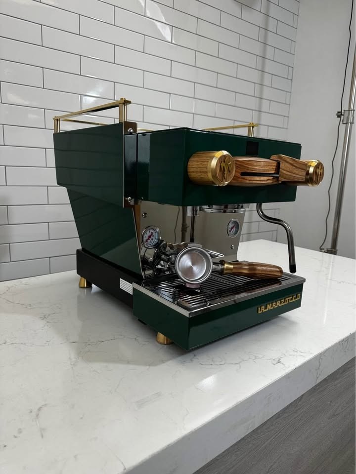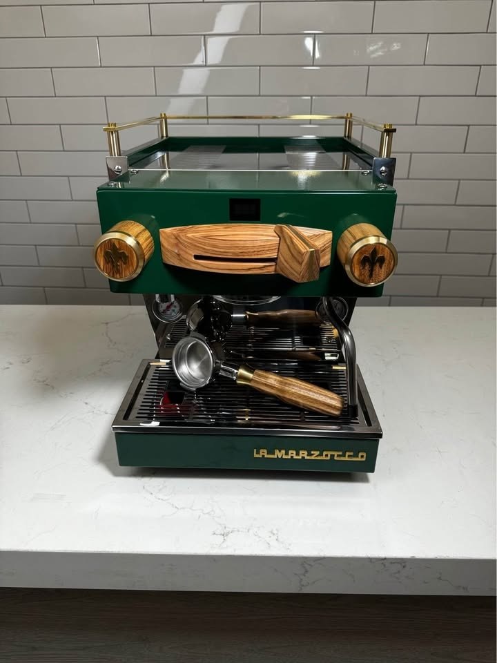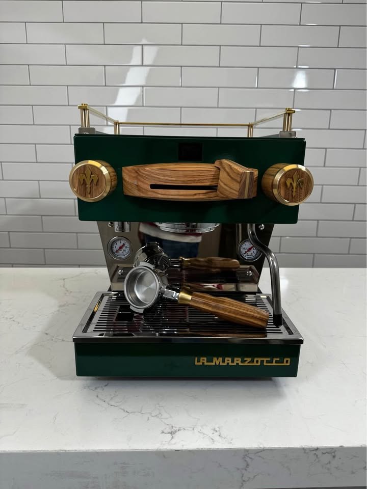 Selling a beautiful custom powdercoated La Marzocco Linea Mini espresso machine in a striking R Green finish. This unit features brass and wood accents on the paddle, knobs, and portafilter a unique, eye-catching upgrade from the standard design.
